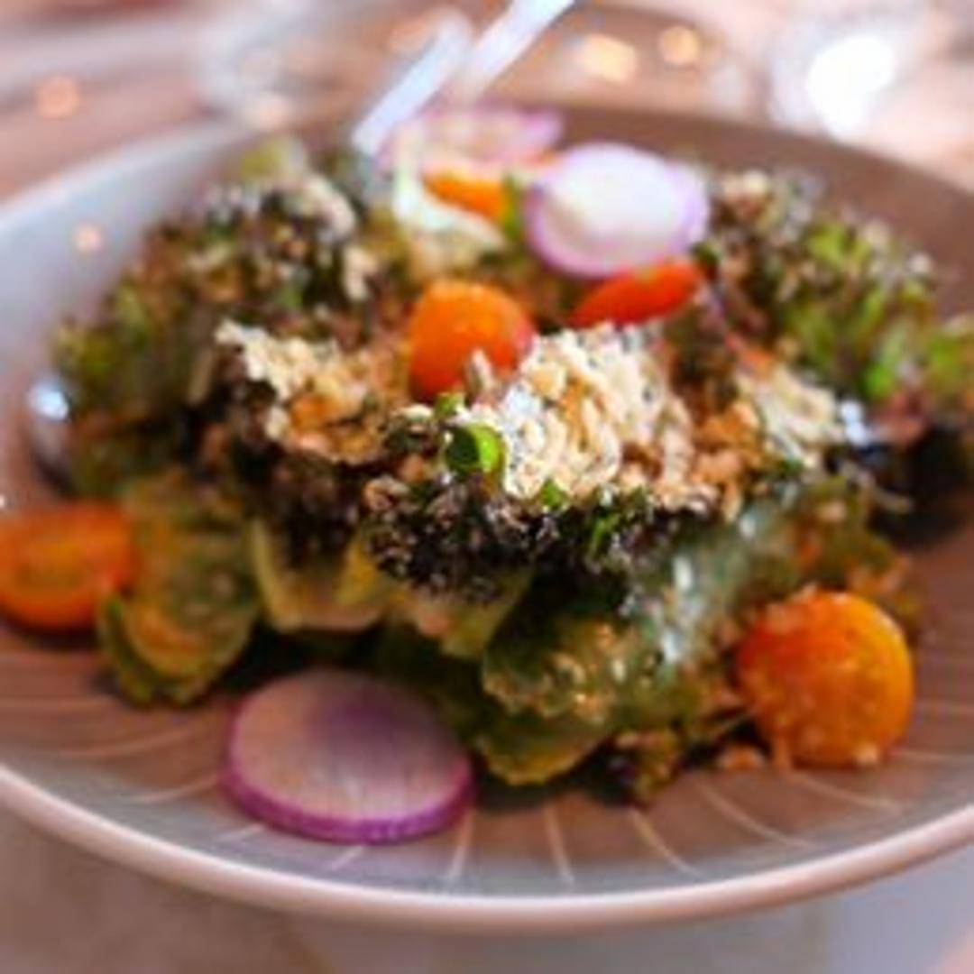 A hearty and healthy salad featuring finely chopped kale, tossed with a flavorful dressing and a variety of toppings, such as toasted nuts, dried fruits, and crumbled cheese. A satisfying and nutritious choice.