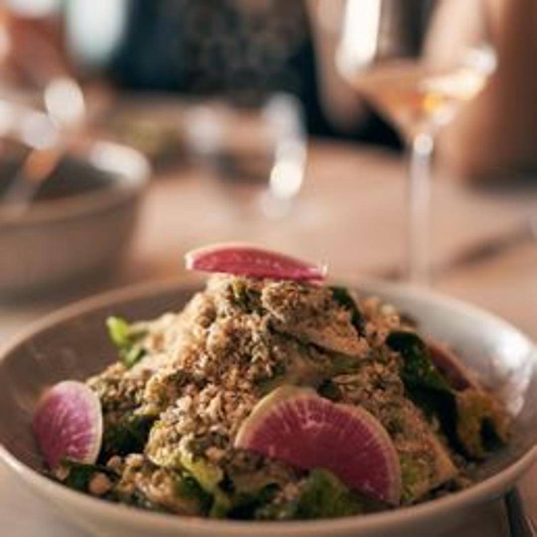 A refreshing salad featuring crisp Little Gem lettuce, tossed with a light vinaigrette and seasonal accompaniments. Expect a bright and subtly sweet flavor profile with a satisfying crunch.