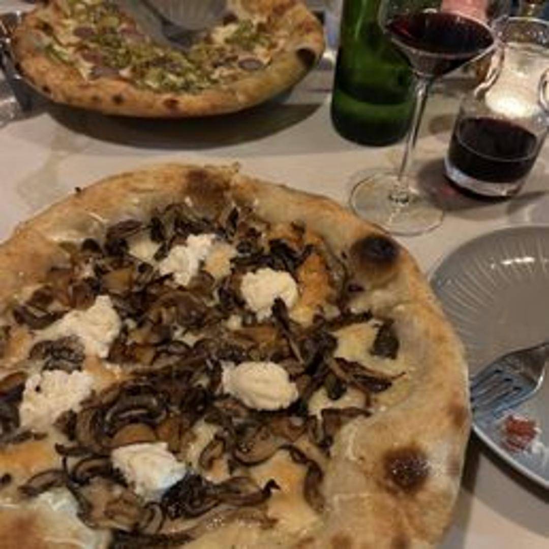 A unique pizza featuring a Korean-inspired twist. Topped with a tangy and spicy kimchi base, mozzarella cheese, and potentially other ingredients such as gochujang sauce, sesame seeds, or a protein.