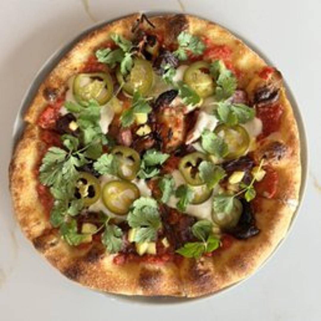 A pizza made entirely without animal products. Features a plant-based crust, sauce, vegan cheese alternative, and a variety of vegetable toppings.