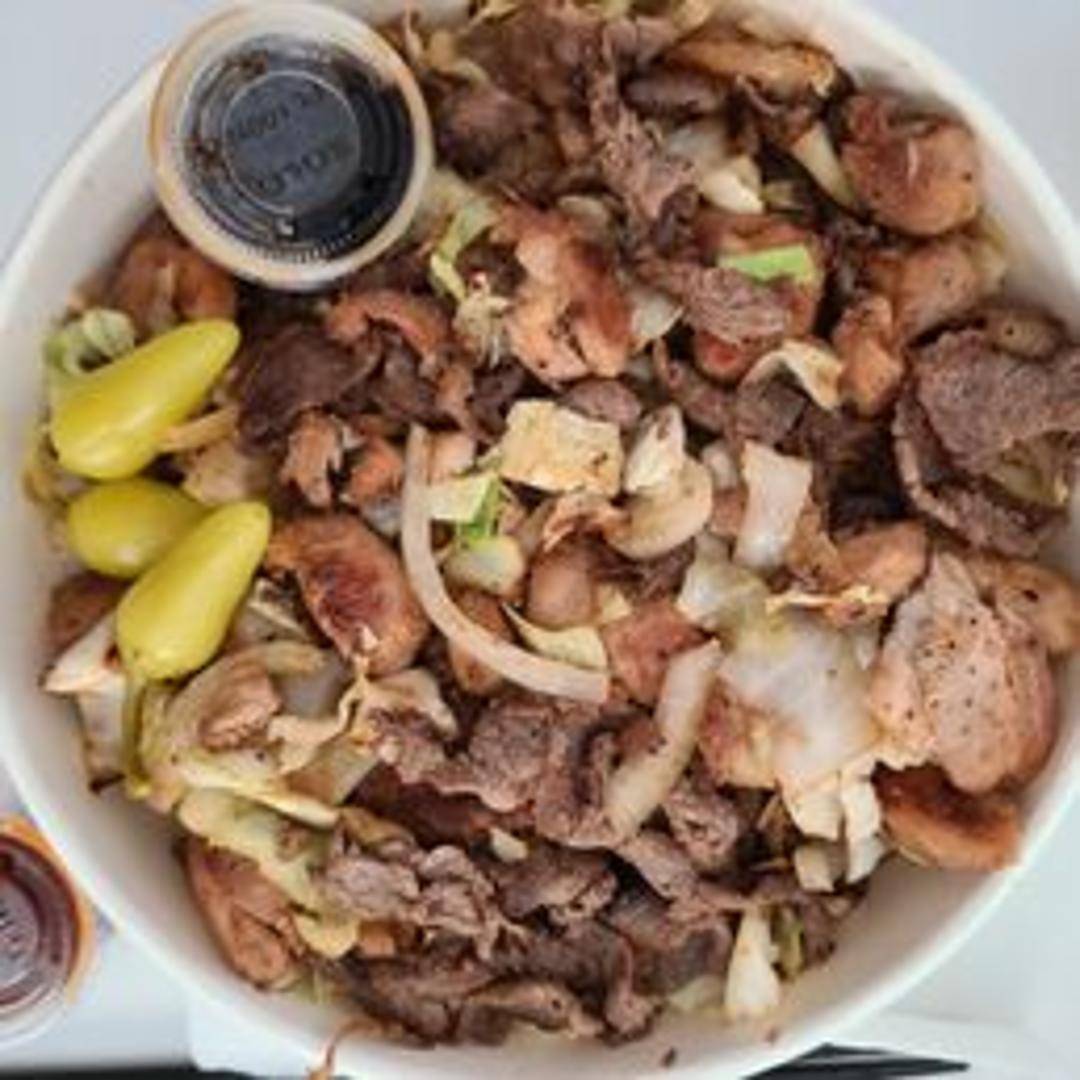 A satisfying plate featuring grilled chicken marinated in a classic teriyaki sauce. Served with a side of steamed rice and a mix of fresh vegetables, like lettuce, carrots and cabbage.