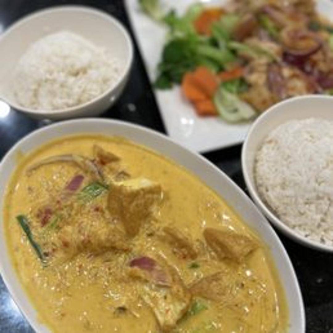 A creamy and aromatic coconut curry with your choice of protein (chicken, beef, pork, shrimp, or tofu), simmered with vegetables (bell peppers, onions, carrots, and potatoes) in a rich coconut milk broth. Served with steamed rice or noodles.
