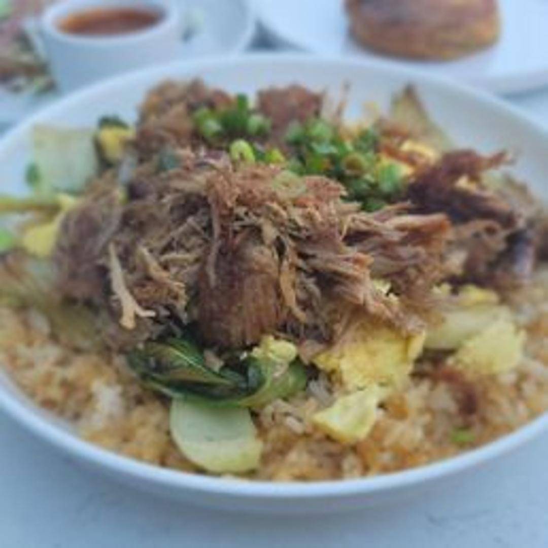 Fragrant fried rice with tender pieces of duck, eggs, vegetables, and a savory sauce.
