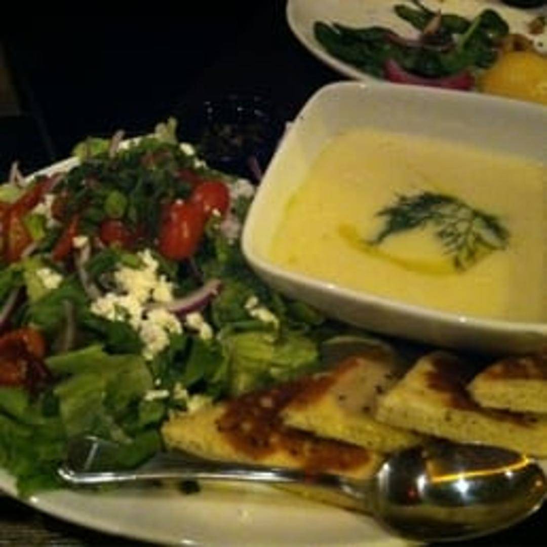 A traditional Greek soup featuring a delicate balance of chicken broth, lemon juice, and rice. The soup is finished with a creamy egg-lemon sauce (avgolemono), creating a comforting and flavorful experience. Served hot.