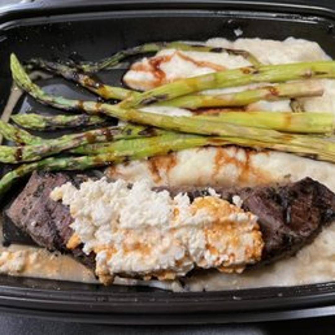 Grilled flank steak marinated in a blend of Greek spices and topped with a generous portion of spicy feta cheese. The steak is tender and flavorful, complemented by the creamy, tangy, and slightly fiery feta. Served with your choice of side.