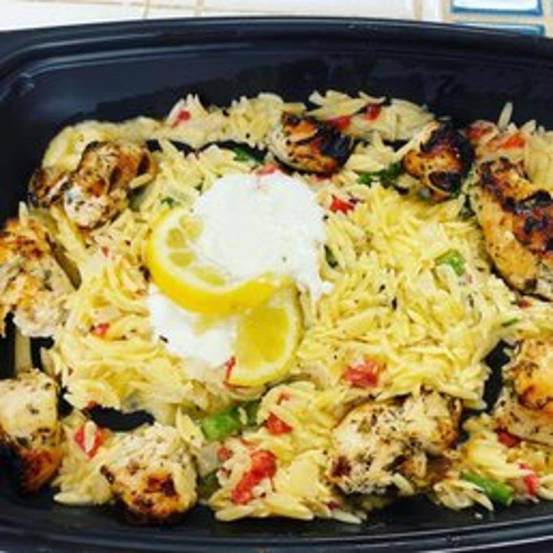 Tender pieces of chicken breast, marinated in lemon and herbs, served over a bed of perfectly cooked orzo pasta. A light and refreshing dish with a bright, citrusy flavor, balanced with savory notes of herbs and olive oil. Garnished with fresh parsley.