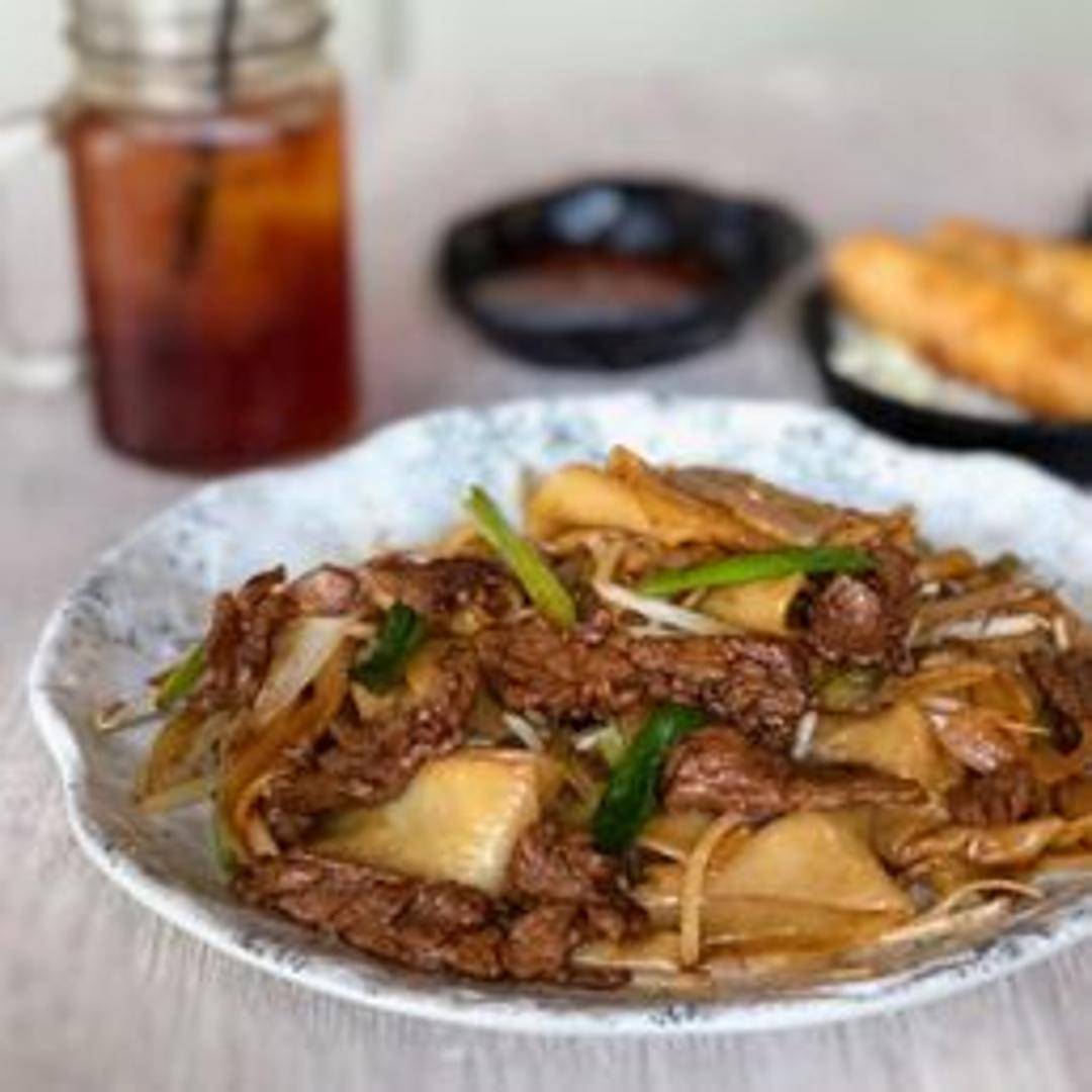 Experience a classic Cantonese favorite with our Beef Chow Fun. This dish highlights wide, flat rice noodles (ho fun) expertly wok-fried to achieve a perfect 'wok hei' (breath of the wok) smoky essence. Tender slices of marinated beef are stir-fried with crisp bean sprouts and green onions in a savory, umami-rich sauce, offering a satisfying and authentic noodle experience.