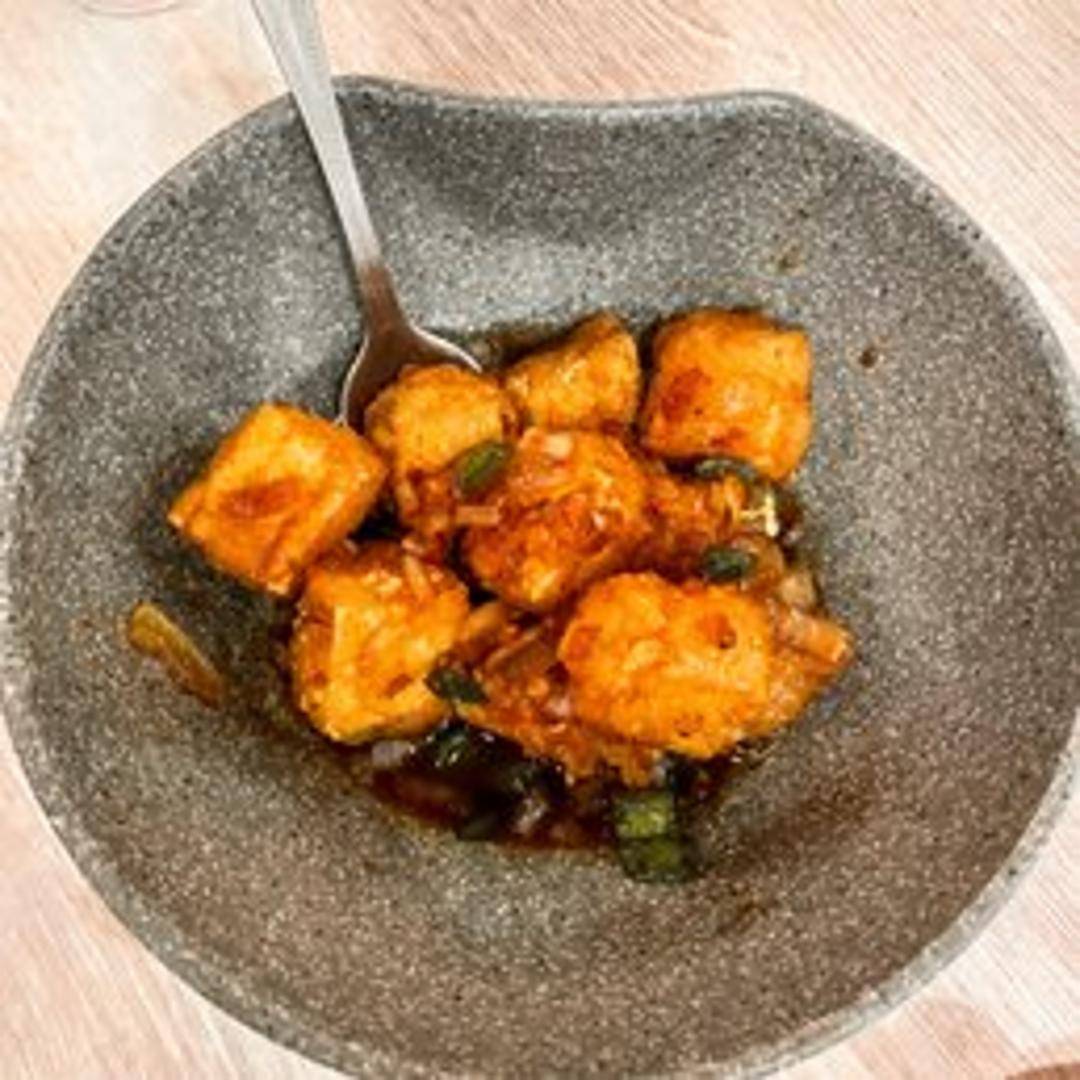 A delectable vegetarian offering featuring golden-fried tofu cubes, perfectly crispy on the outside and tender within. Each piece is tossed in a vibrant and zesty sauce, delivering a delightful spicy kick that tantalizes the taste buds, making it an ideal appetizer or a light main course.