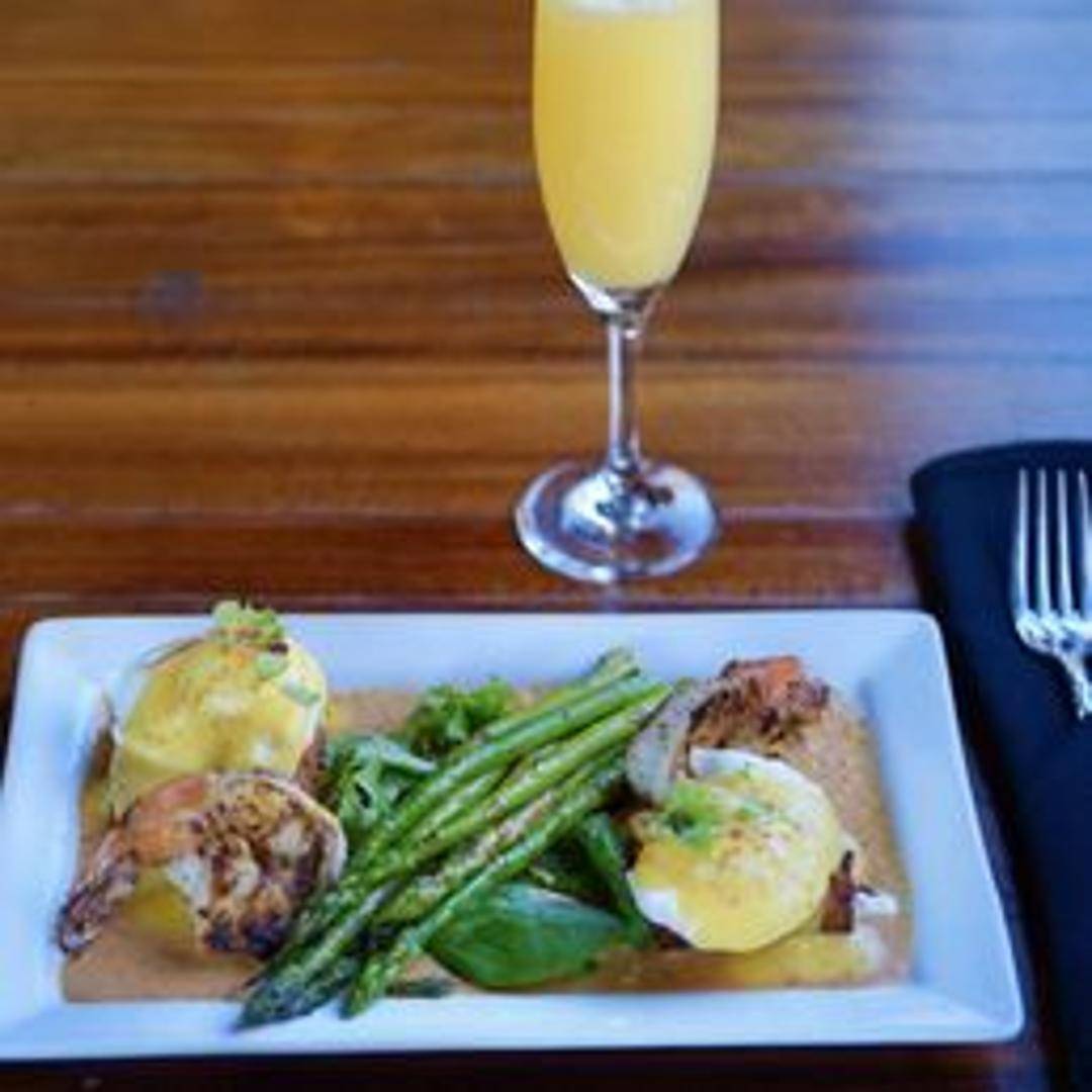 A Southern-inspired twist on a classic, featuring creamy, stone-ground grits topped with plump, seasoned shrimp and two perfectly poached eggs. Finished with a luscious hollandaise sauce, creating a rich and comforting brunch experience.