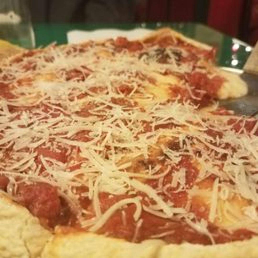 A deep-dish pizza filled with mozzarella cheese and your choice of toppings, topped with a layer of tomato sauce.