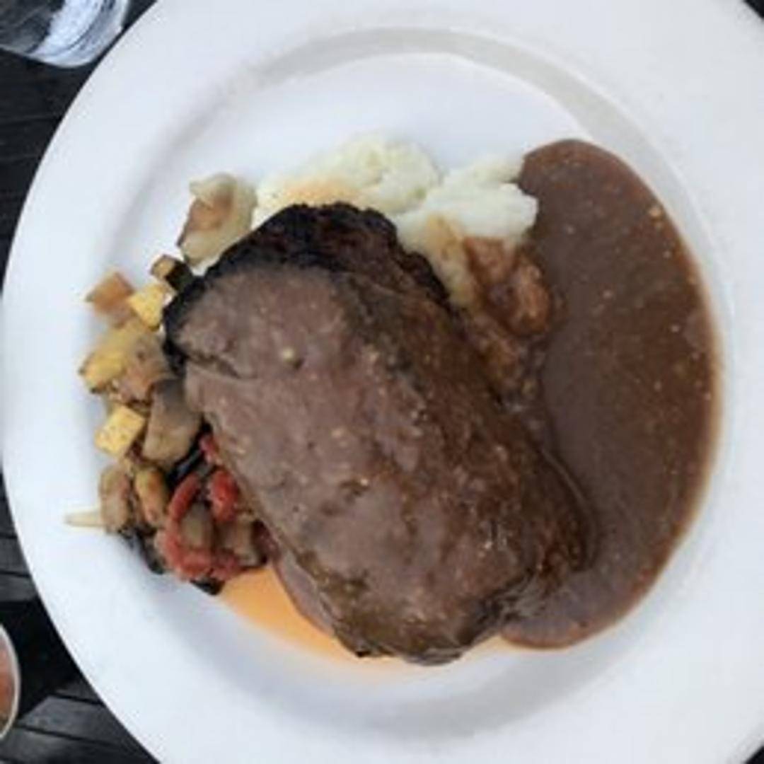 A savory meatloaf infused with creamy Gorgonzola cheese, giving it a distinctive and pungent flavor. Topped with a rich tomato glaze and served with a side of roasted root vegetables.