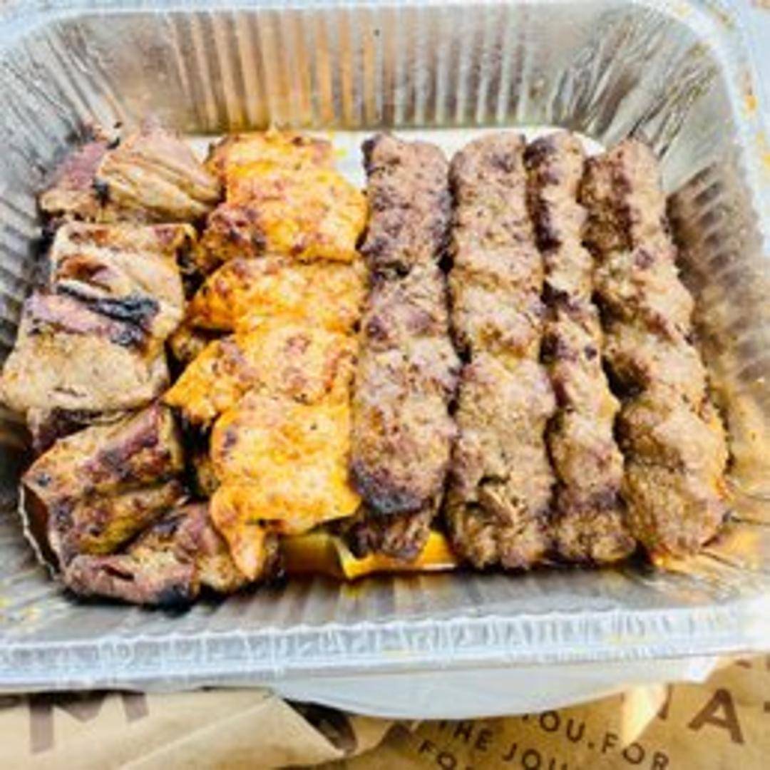 Ground beef seasoned with Persian spices, skewered and grilled to perfection. Served with your choice of basmati rice, grilled tomato and pepper, and a side of onion and herbs.