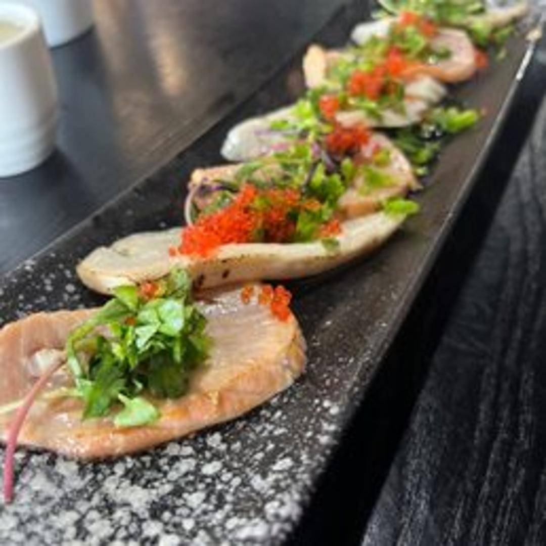 An assortment of thinly sliced, fresh sashimi, prepared with a seared or torched technique and drizzled with special sauces and garnishes.
