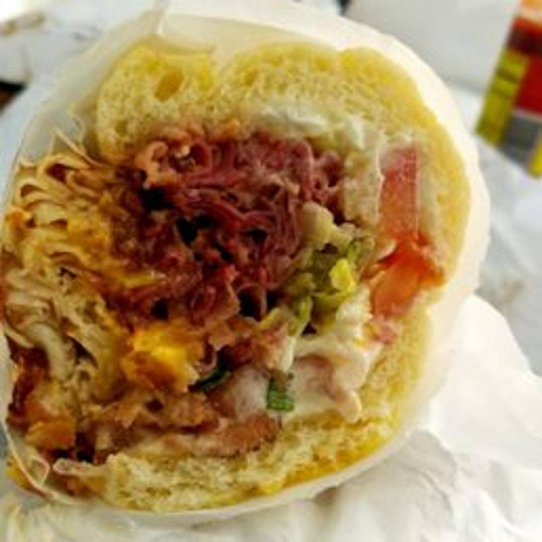 A toasted hero roll piled high with hot pastrami and melted Swiss cheese. Topped with mustard and pickles.