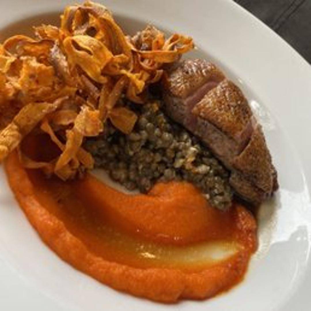 Crispy-skinned pan-roasted duck breast, accompanied by a seasonal fruit compote, wild rice pilaf, and a duck jus.