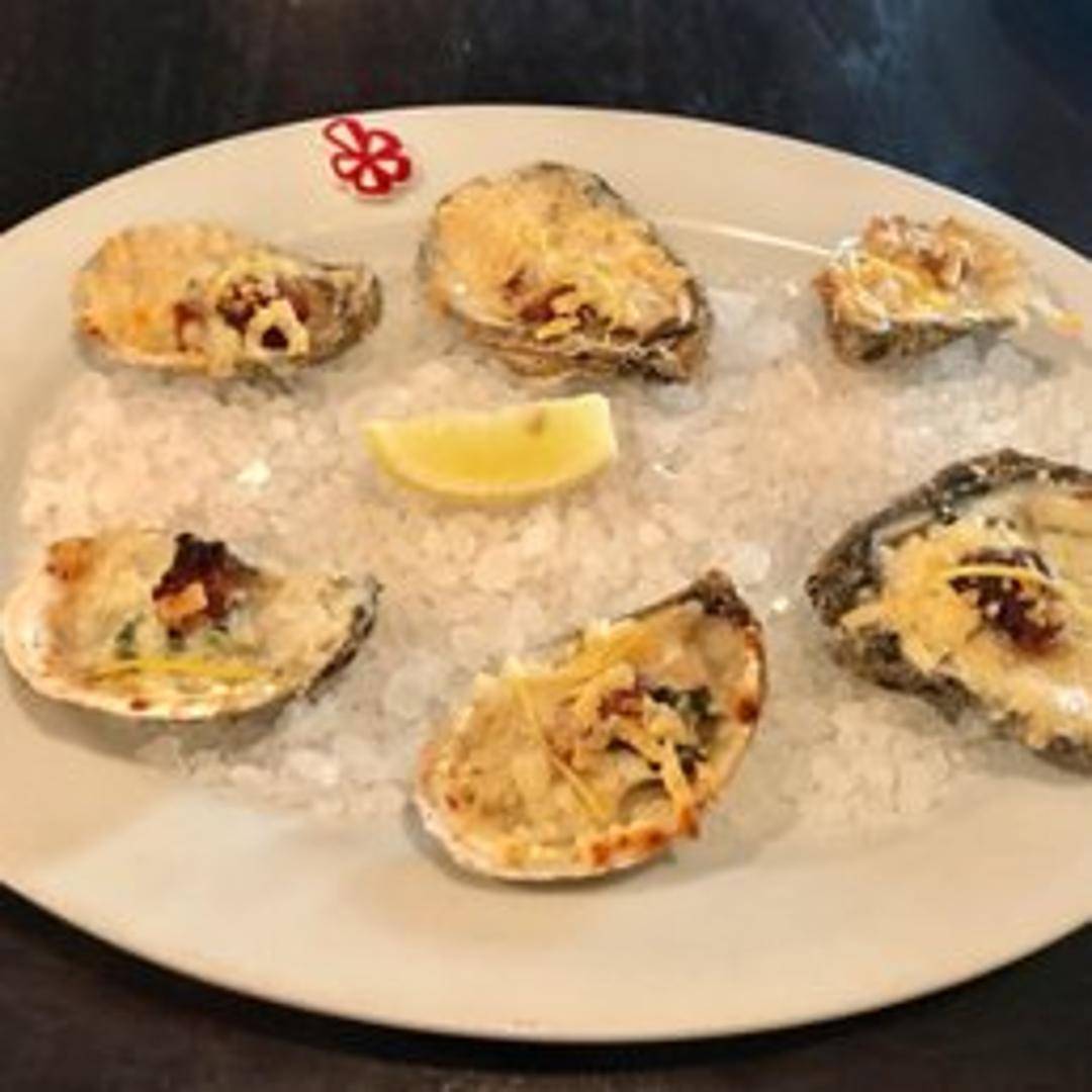 Freshly shucked oysters roasted in their shells with a flavorful compound butter, herbs, and breadcrumbs, creating a rich and savory seafood appetizer.