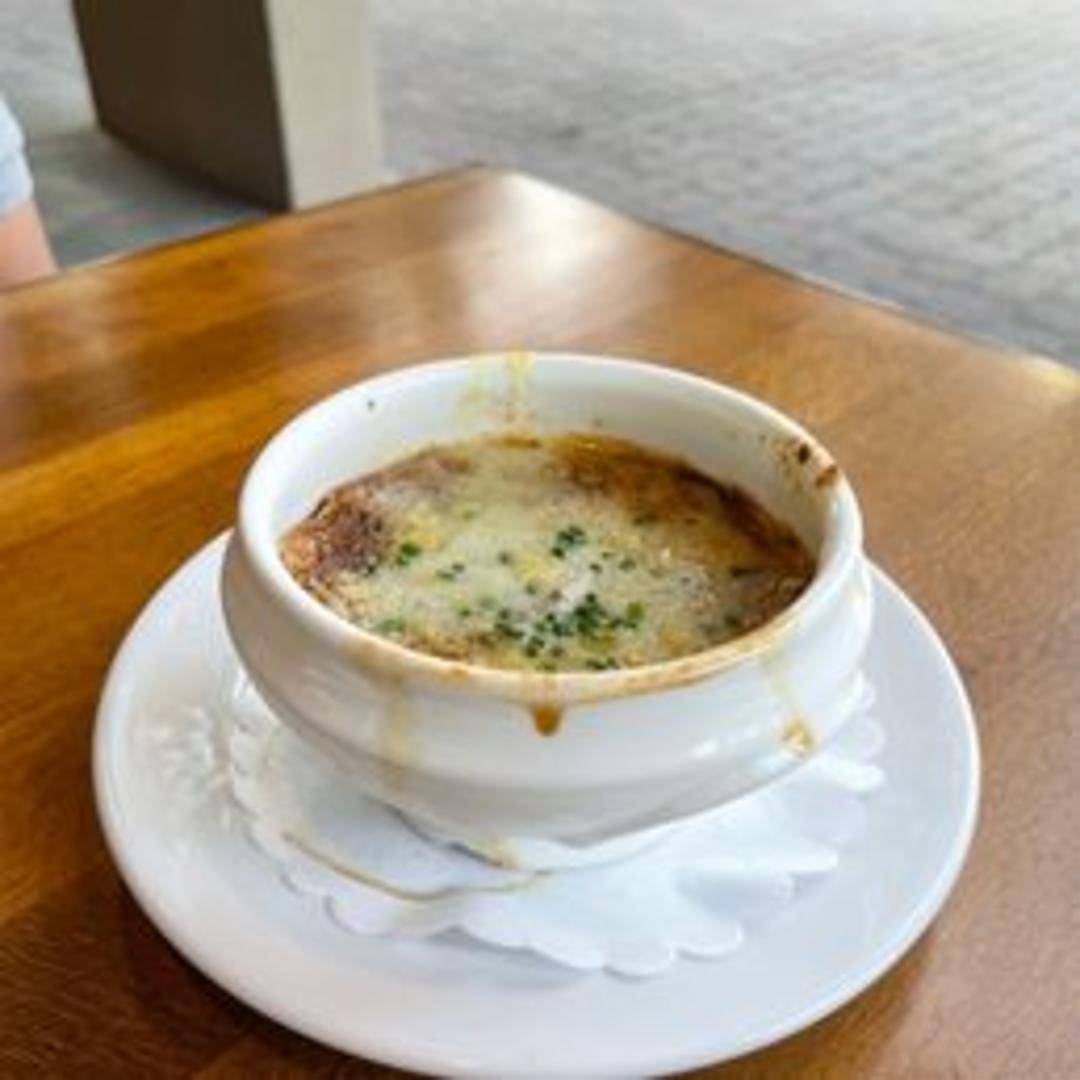 A classic French onion soup, deeply flavored with caramelized onions in a rich beef broth, topped with a crusty crouton and melted Gruyère cheese.