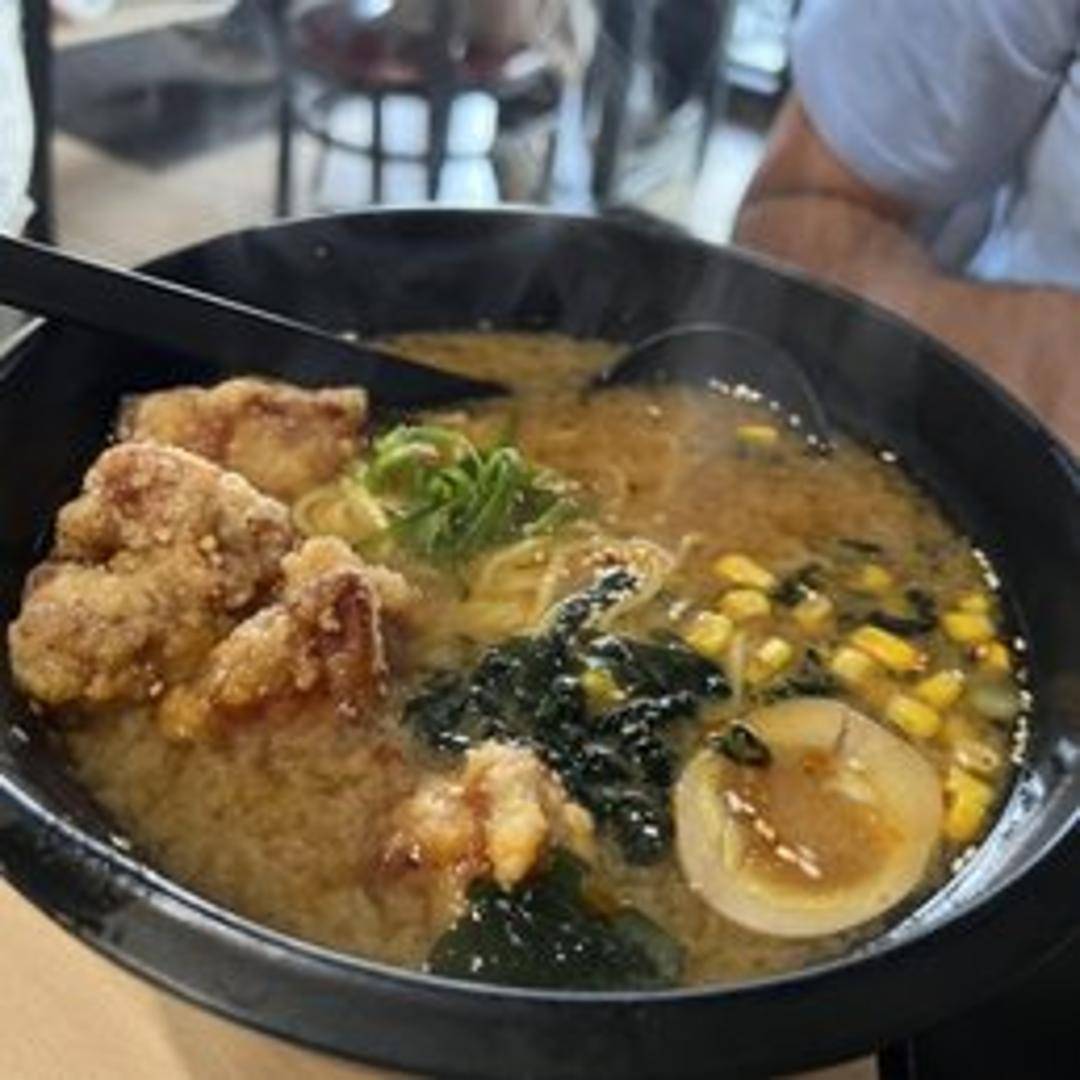 Ramen noodle soup in a savory miso broth, topped with a soft boiled egg, green onions, and other traditional toppings.