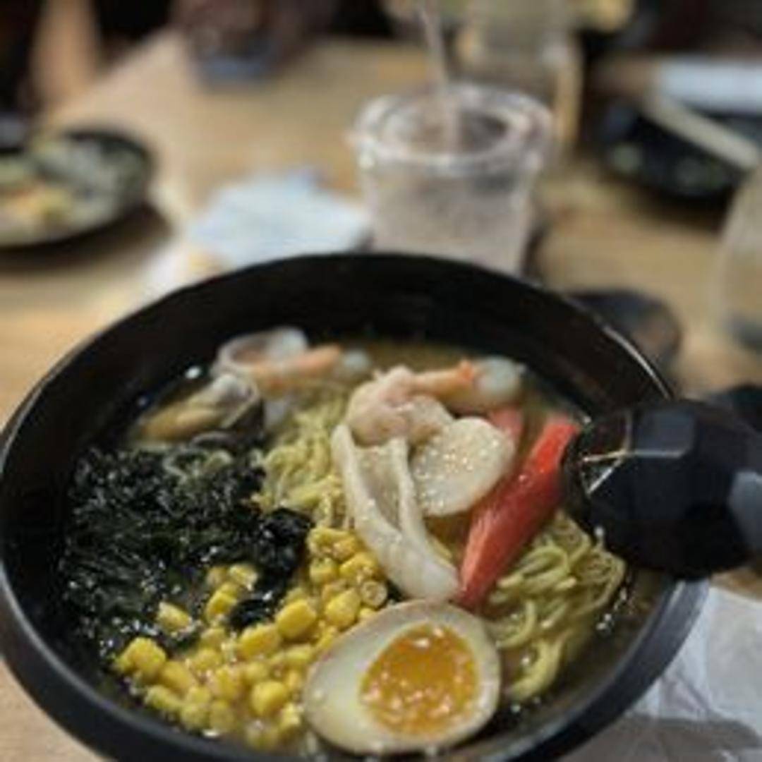 Ramen noodle soup featuring a variety of fresh seafood, a soft boiled egg, green onions, and a rich seafood broth.