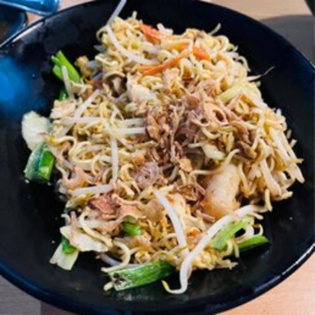 Indonesian-style fried noodles with chicken, shrimp, vegetables, and a flavorful blend of spices.
