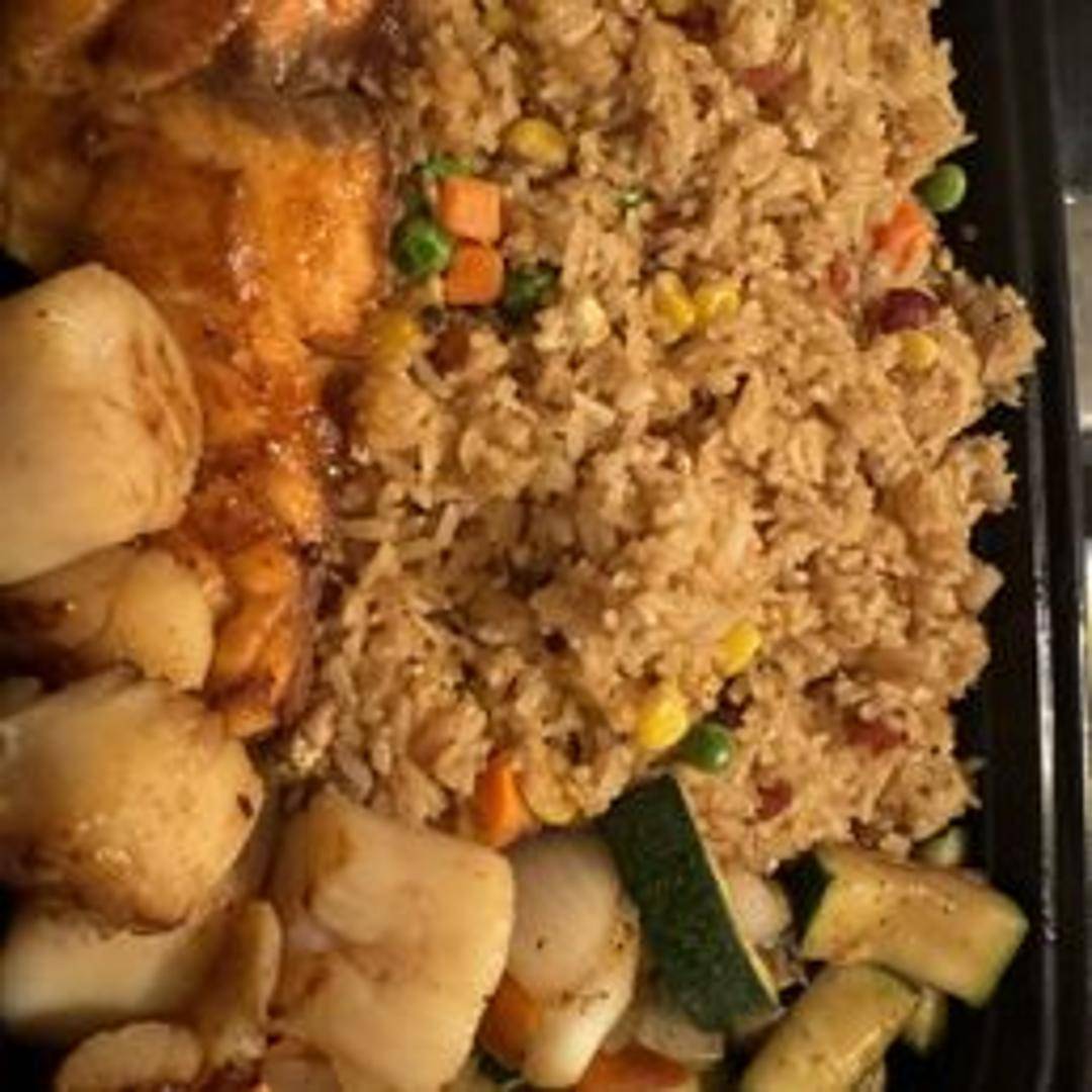 Succulent sea scallops grilled to perfection on a Japanese teppanyaki grill. Seasoned with light soy sauce and delicate spices to enhance their natural sweetness. Served with stir-fried vegetables and your choice of steamed rice or fried rice.