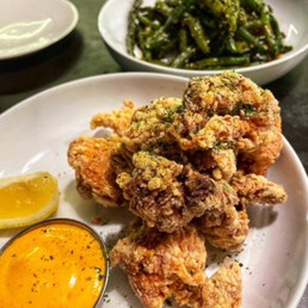 Japanese-style fried chicken. Bite-sized pieces of chicken marinated in ginger, garlic, and soy sauce, then coated in potato starch or flour and deep-fried to a crispy golden brown. Usually served with lemon wedges or a dipping sauce.