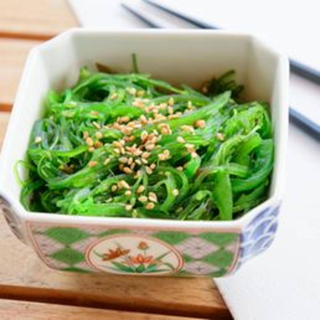 A refreshing salad made with various types of green seaweed, typically seasoned with sesame oil, vinegar, and soy sauce.