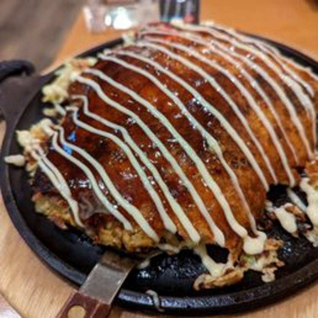A savory pancake similar to okonomiyaki but with added fried noodles.