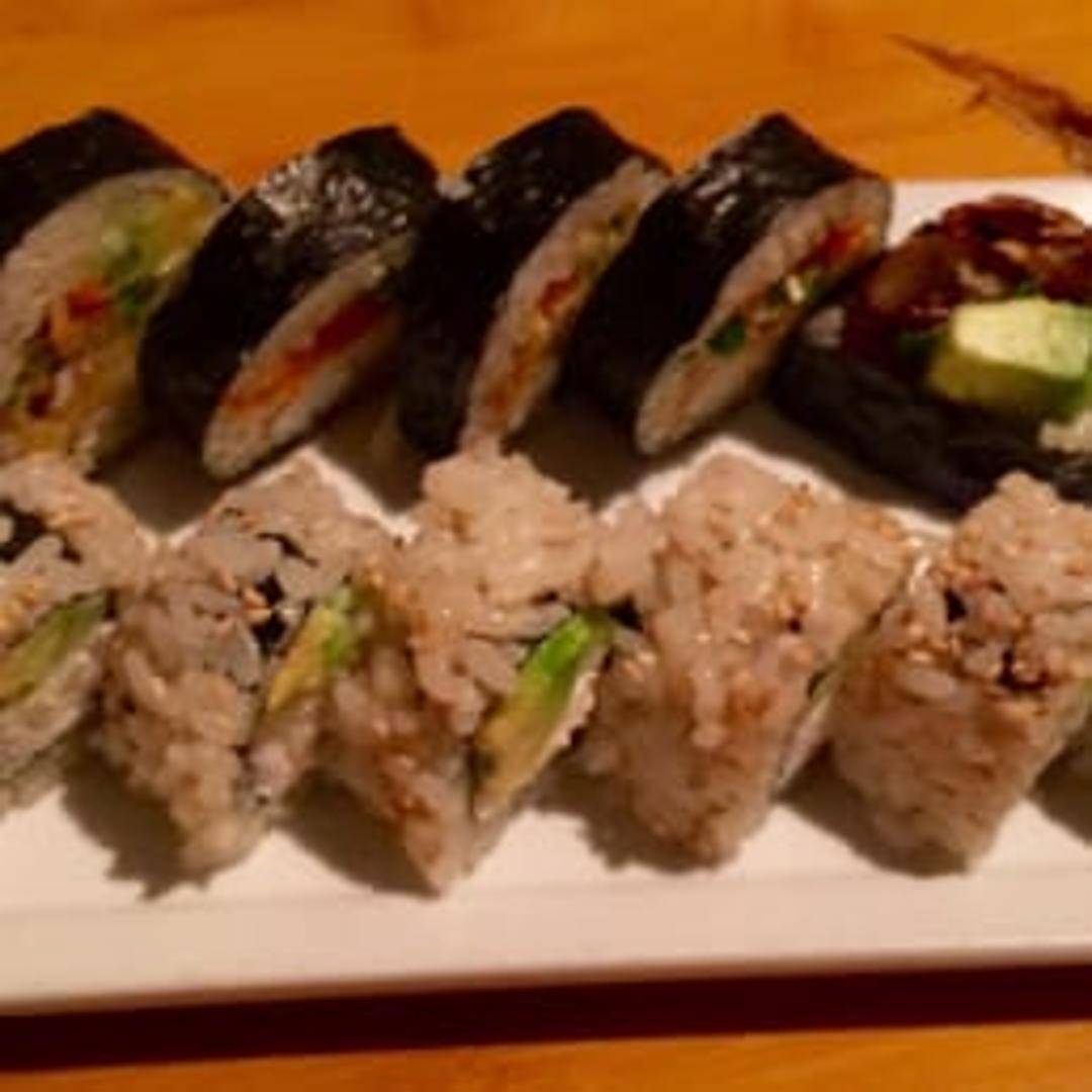 A popular sushi roll featuring avocado, cucumber, and imitation crab meat, wrapped in seasoned sushi rice and nori seaweed.