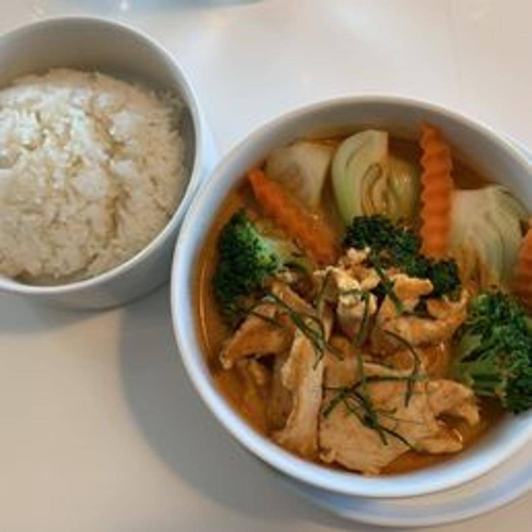 A rich and flavorful Thai curry with a creamy coconut milk base, infused with red curry paste, peanuts, and fragrant spices. Typically includes bell peppers, carrots, and your choice of protein (chicken, beef, pork, tofu, or shrimp). Served with steamed rice.