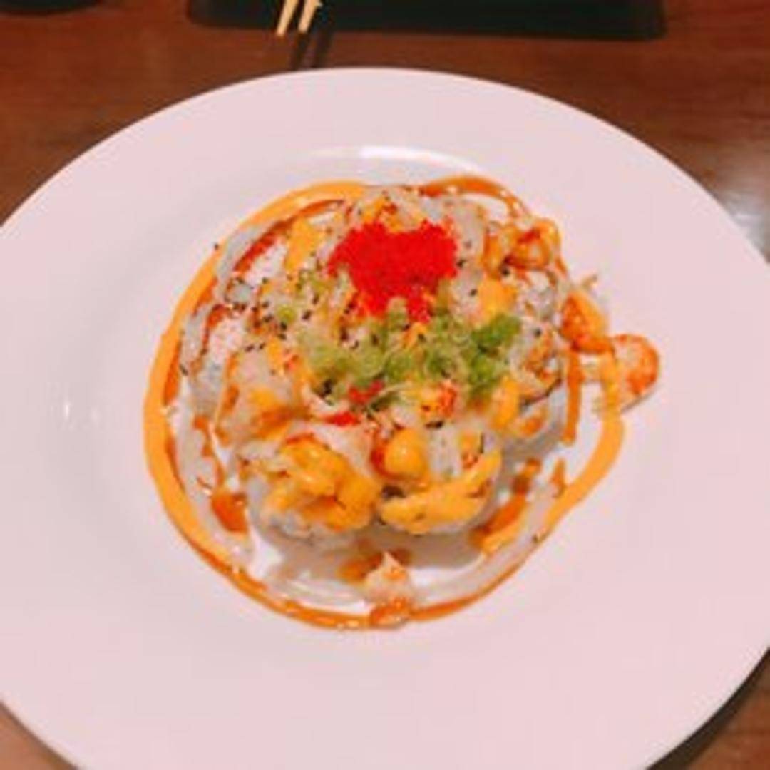 A sushi roll filled with lobster meat and other ingredients, baked to perfection. The roll is often topped with a creamy sauce and finished with a light browning.