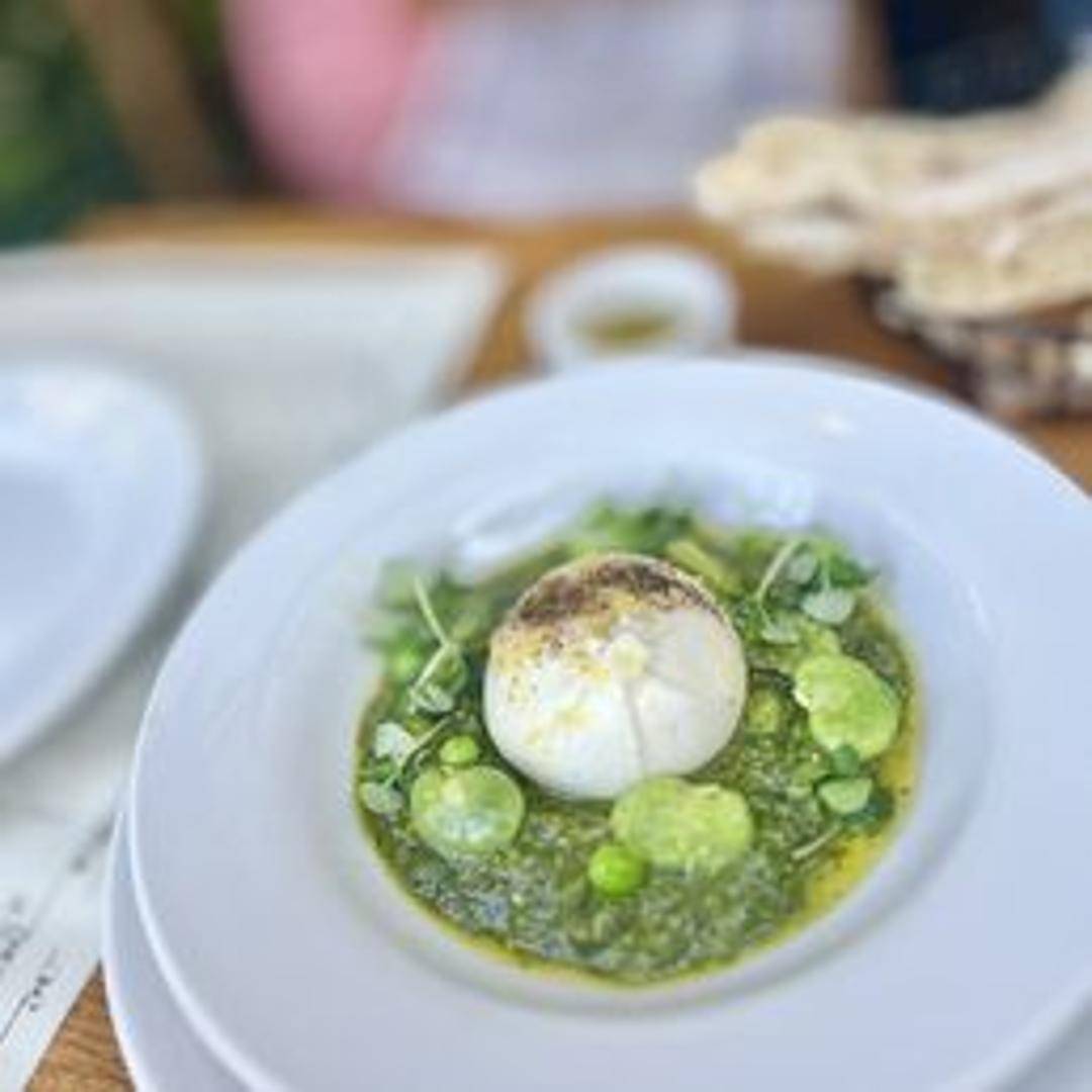 Creamy burrata cheese served with a vibrant, house-made pesto sauce, accompanied by crusty bread for dipping.