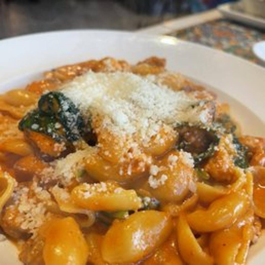 Orecchiette pasta, shaped like 'little ears' to perfectly scoop up sauce, generously coated in a classic Alla Vodka sauce—a creamy tomato sauce enhanced with a hint of vodka, fresh herbs, and a touch of red pepper.