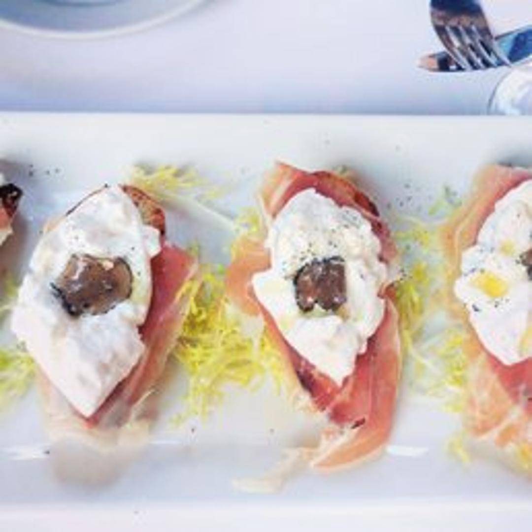 A harmonious blend of textures and tastes, our Prosciutto Burrata Crostini features crispy toasted bread slices topped with creamy, decadent burrata cheese, thinly sliced, delicate prosciutto, and a drizzle of premium olive oil. This appetizer offers a delightful balance of salty and creamy, ideal for starting your meal.