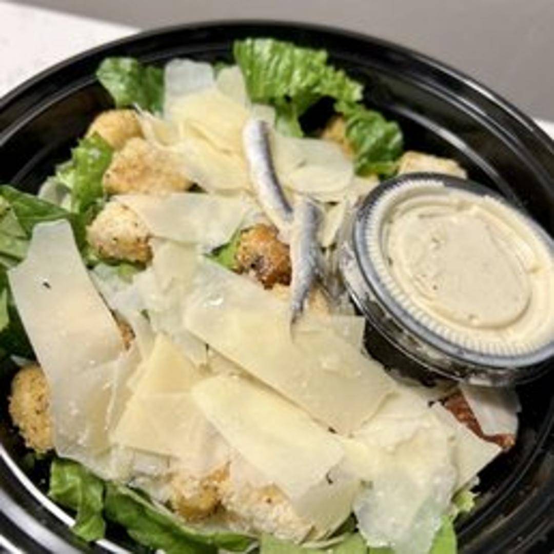 Classic Caesar salad with romaine lettuce, creamy Caesar dressing (typically made with anchovies, garlic, lemon juice, and Parmesan cheese), croutons, and Parmesan shavings. Often served as a starter.