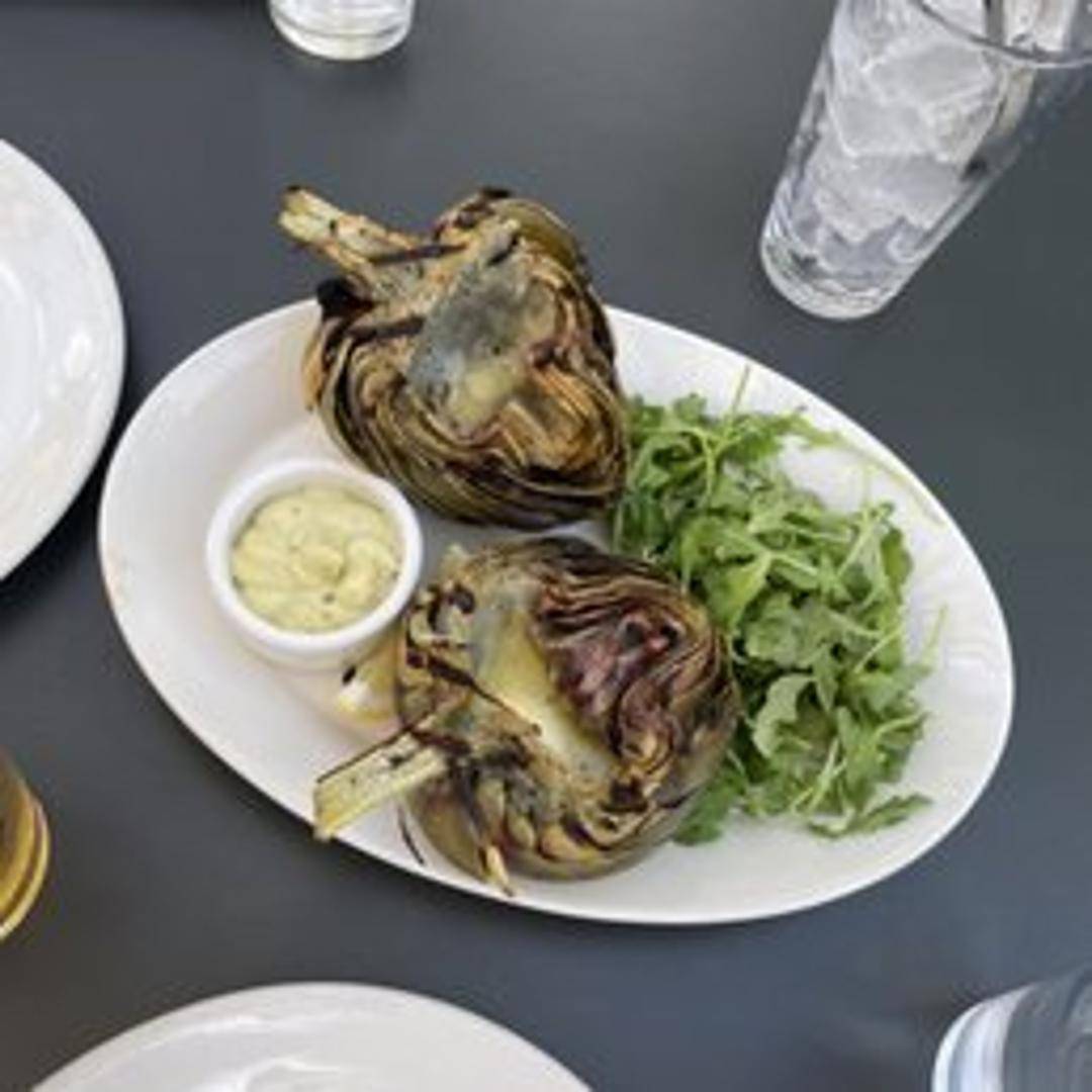 Fresh artichoke grilled until tender and slightly charred. Served with a dipping sauce, such as aioli, pesto, or a lemon vinaigrette. The leaves are typically pulled off and scraped with the teeth to extract the flesh.