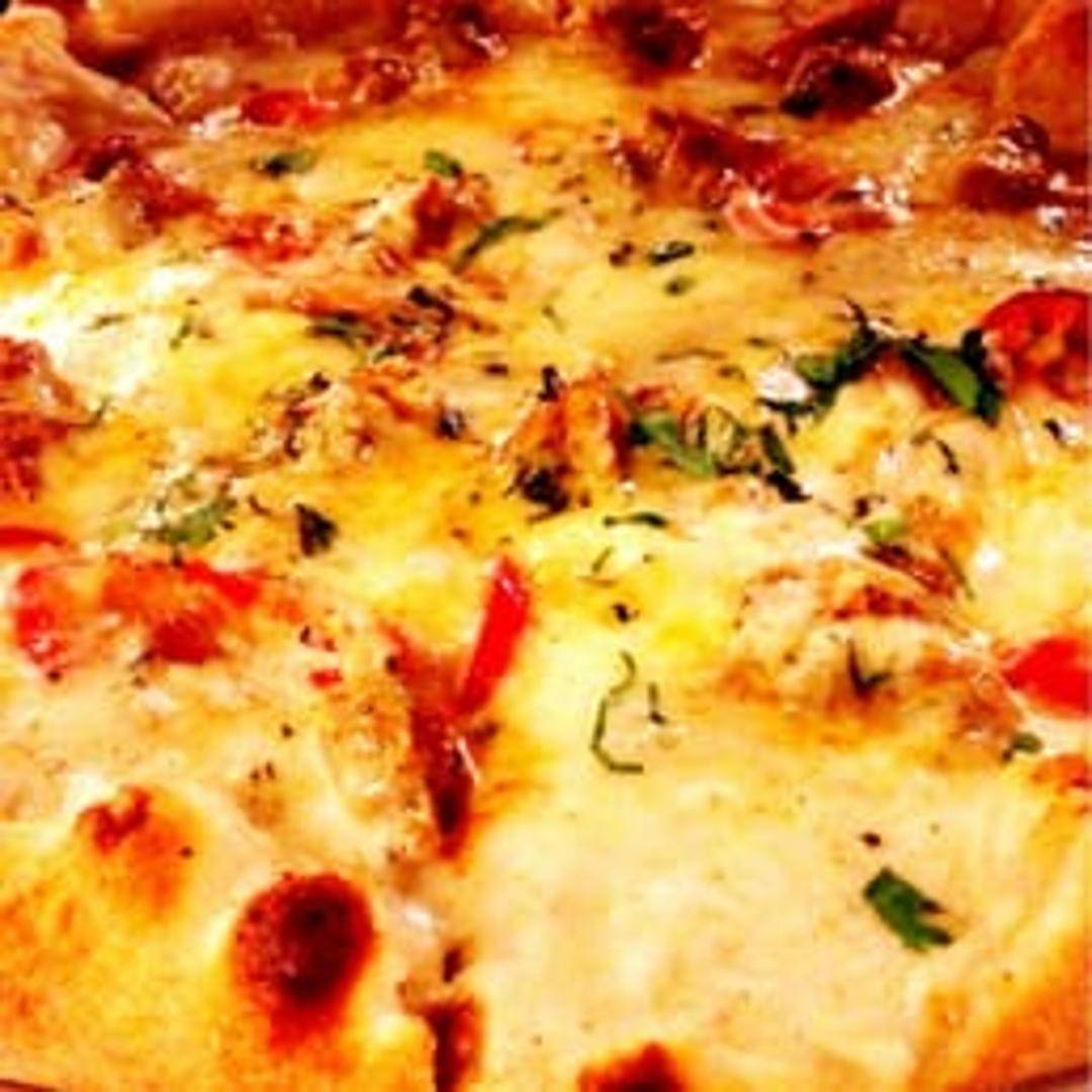 A pizza featuring house-made Italian sausage, likely seasoned with fennel, garlic, and other herbs. Topped with mozzarella cheese and a tomato-based sauce on a traditional crust.