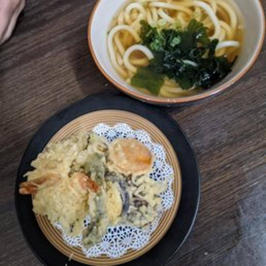 Thick, chewy udon noodles in a flavorful broth, topped with crispy tempura shrimp and vegetables. Garnished with scallions and seaweed.