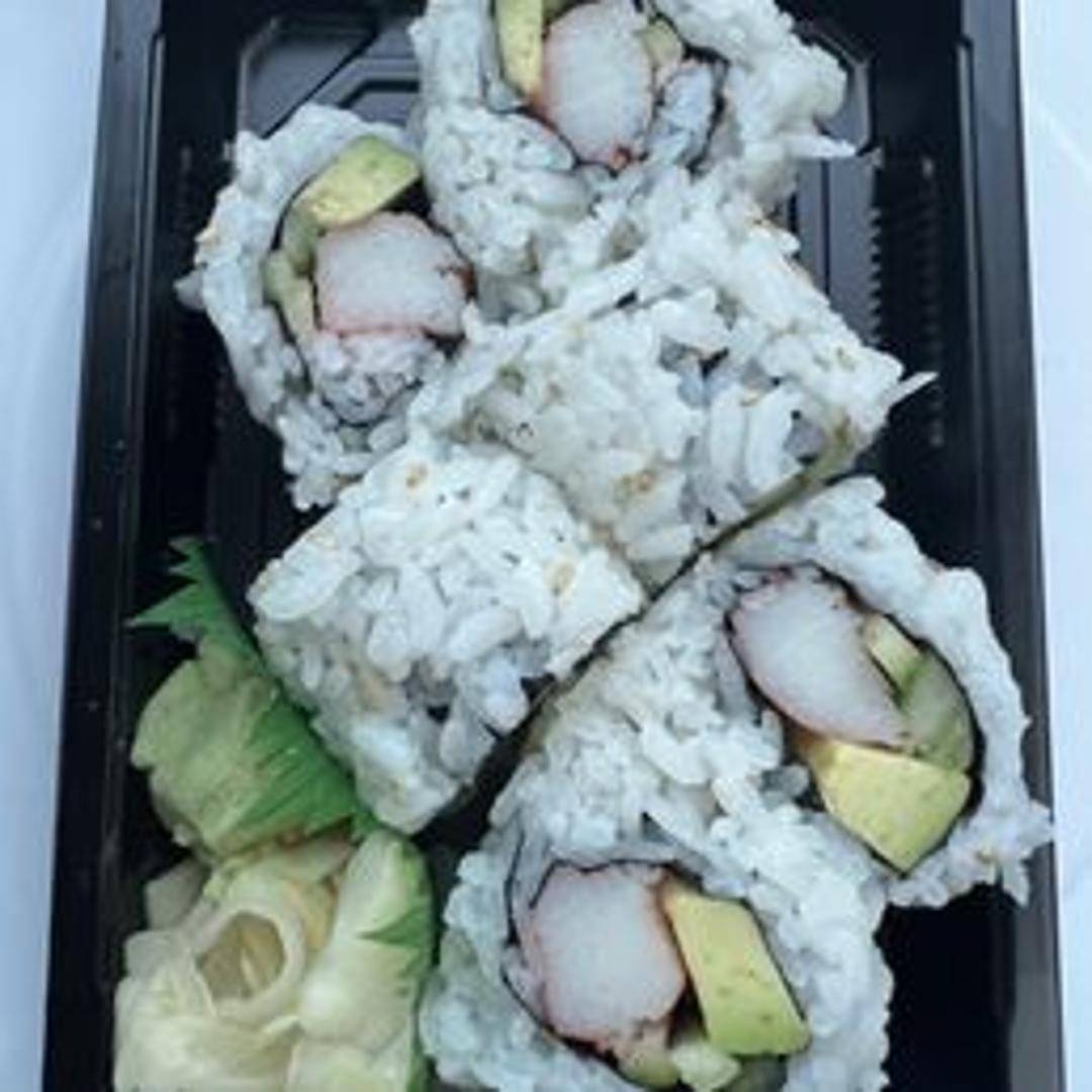 Imitation crab meat, avocado, and cucumber rolled in sushi rice and seaweed, typically topped with sesame seeds. Served with ginger, wasabi, and soy sauce.
