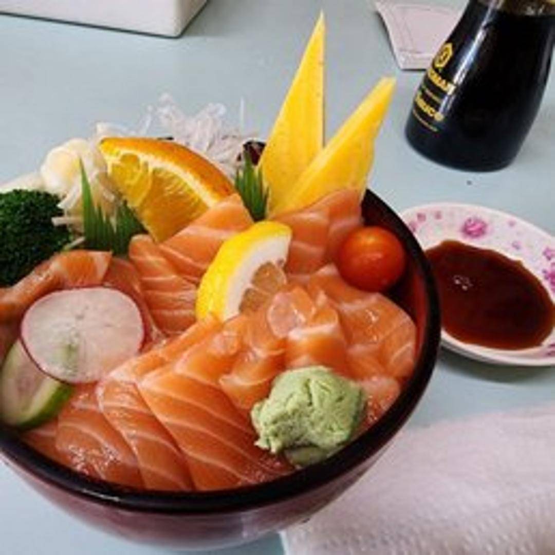 Delicate slices of fresh, high-quality salmon sashimi, known for its rich flavor and buttery texture. Served with wasabi, pickled ginger, and soy sauce for dipping.