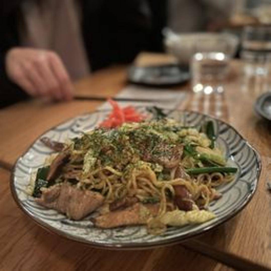 Japanese stir-fried noodles with pork, cabbage, carrots, and onions, seasoned with a sweet and savory yakisoba sauce and topped with dried seaweed flakes and pickled ginger.