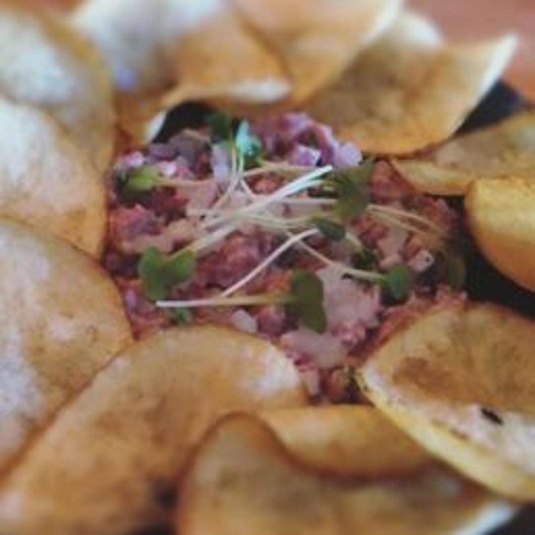 A tender and juicy steak, pan-seared to perfection and topped with a creamy, tangy tartar sauce featuring finely chopped pickles, onions, and herbs. Served with a side of seasonal vegetables.
