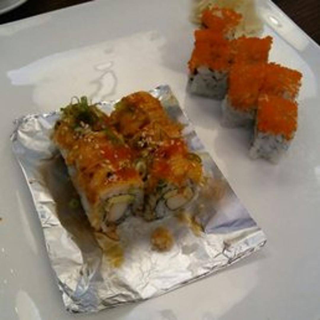 A popular maki sushi roll. Imitation crab meat, avocado, and cucumber are rolled inside nori seaweed and sushi rice. The roll is then coated with sesame seeds and served with pickled ginger, wasabi, and soy sauce.
