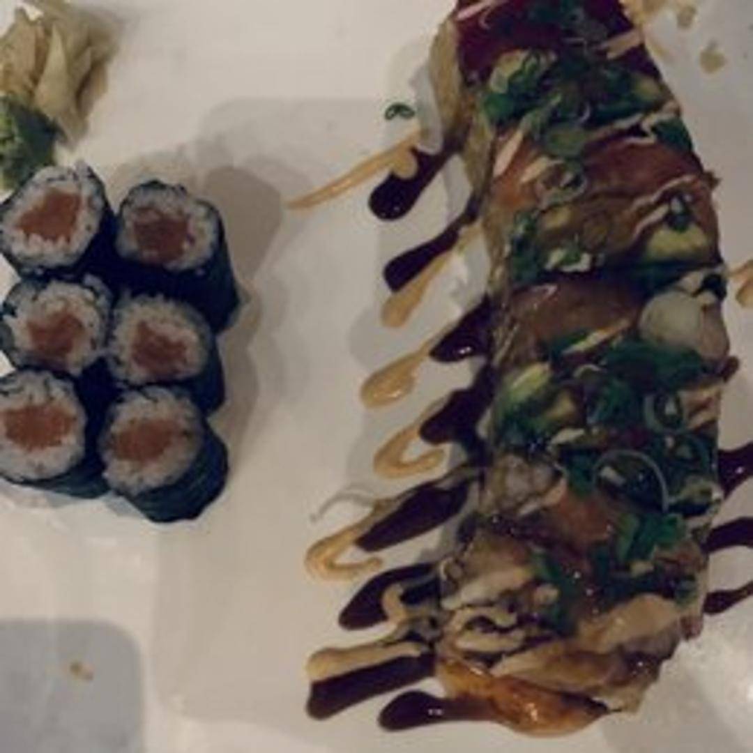 A California roll wrapped with assorted slices of fresh fish (tuna, salmon, yellowtail, and avocado). Topped with crunchy tempura flakes and drizzled with eel sauce and spicy mayo.