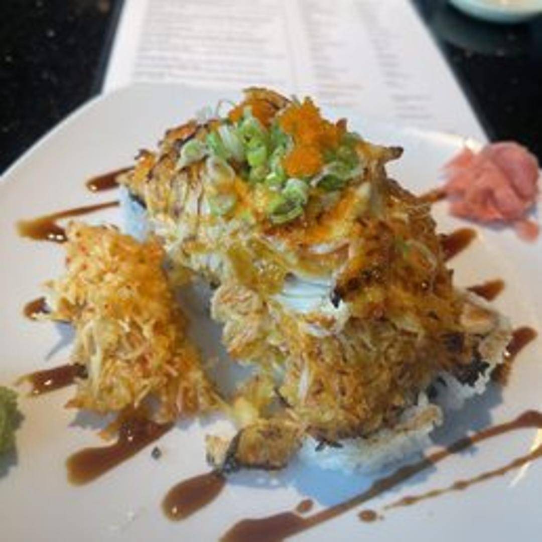 A California roll base topped with baked spicy seafood (scallops, shrimp, and crab) mixed with creamy dynamite sauce. Drizzled with eel sauce and sprinkled with masago and scallions.
