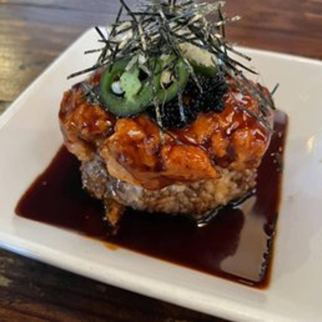 Crispy sushi rice cakes topped with fresh, diced tuna, spicy mayo, avocado, and a drizzle of eel sauce. Garnished with scallions and sesame seeds.