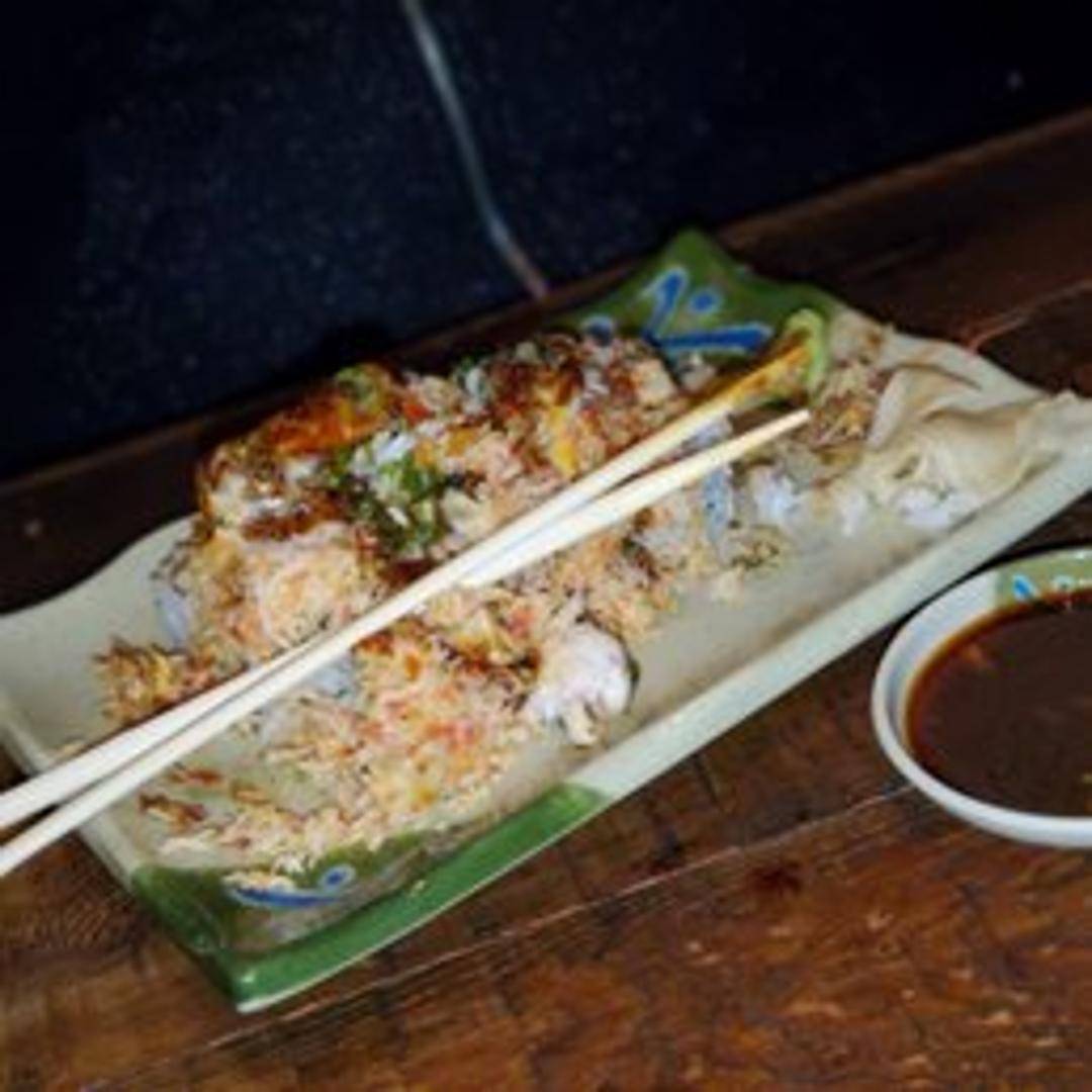 A baked California roll topped with a generous portion of creamy, baked king crab and a sweet, savory sauce. Finished with a sprinkle of sesame seeds and scallions.
