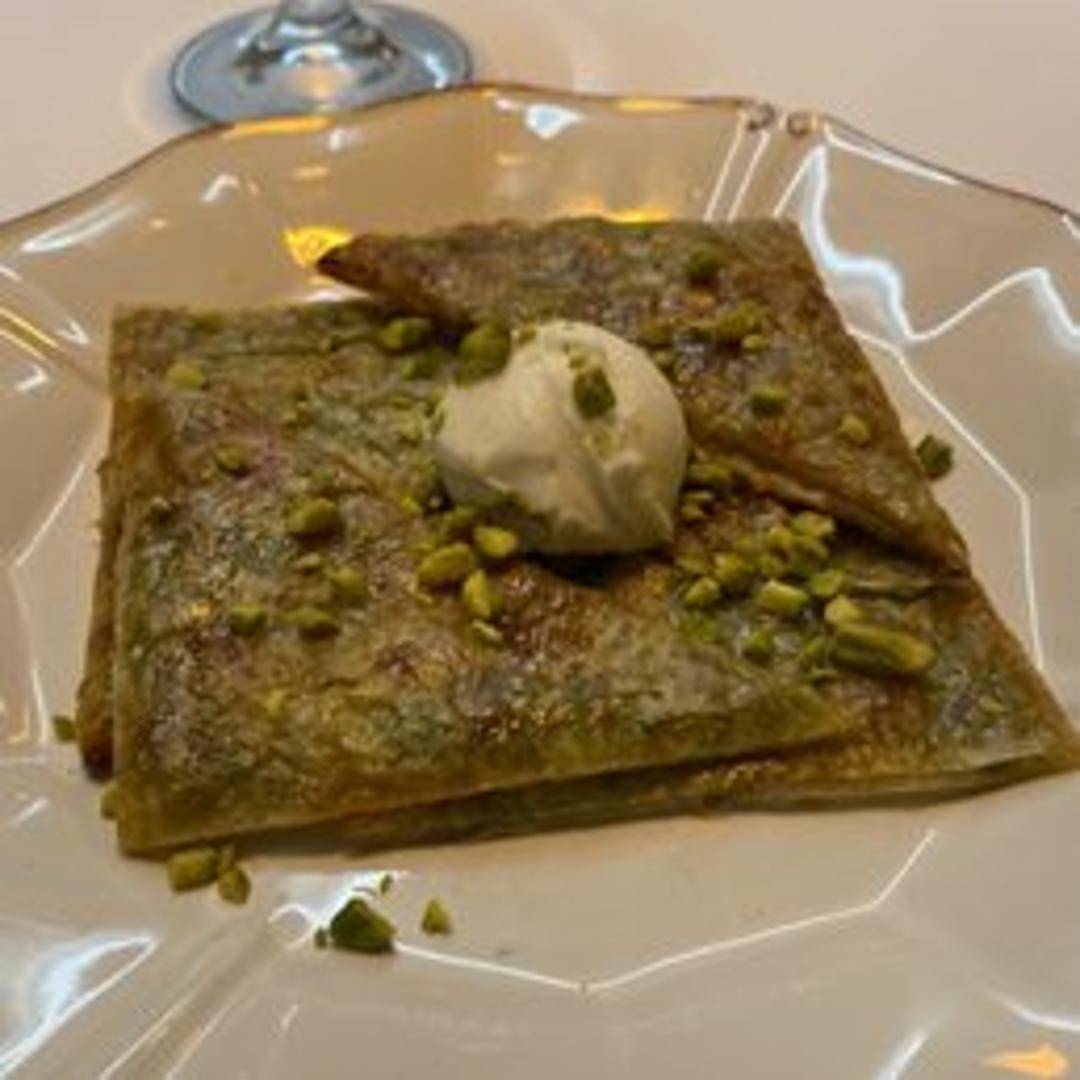 A delightful and delicate Turkish dessert pastry, Katmer is made from ultra-thin, flaky dough layers, traditionally filled with finely ground pistachios and a touch of clotted cream (kaymak). Baked until golden and crispy, it's often served warm, dusted with powdered sugar, offering a uniquely light, buttery, and subtly sweet experience.