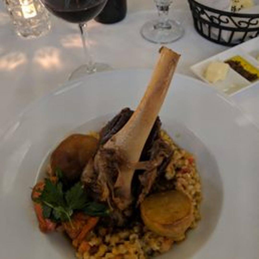 A succulent lamb shank, slow-braised to tender perfection until it effortlessly falls off the bone. This rich and flavorful cut is simmered in a savory broth with aromatic herbs and vegetables, creating a deeply satisfying and hearty main course that embodies traditional Mediterranean comfort.