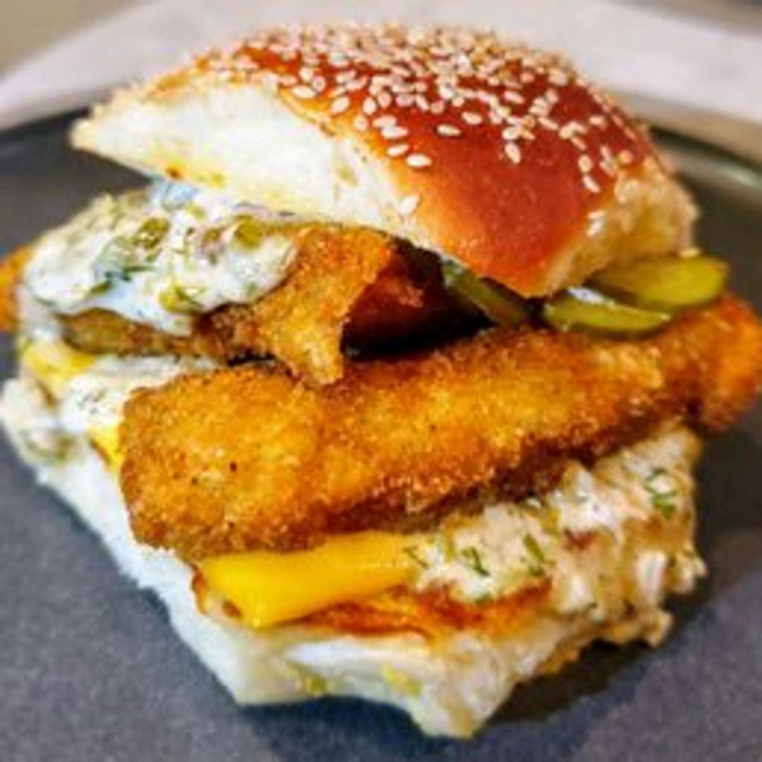 Crispy, golden-fried cod fillet served on a toasted bun with lettuce, tomato, and a tangy tartar sauce.
